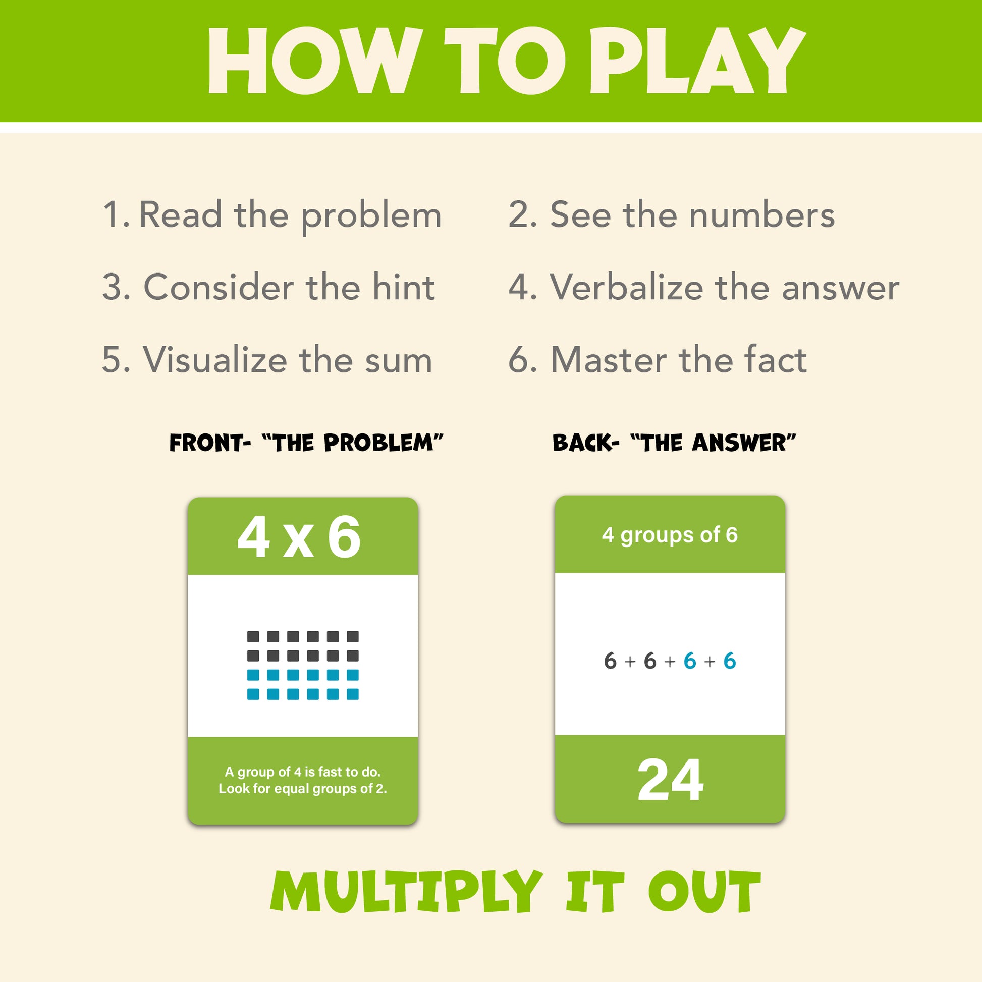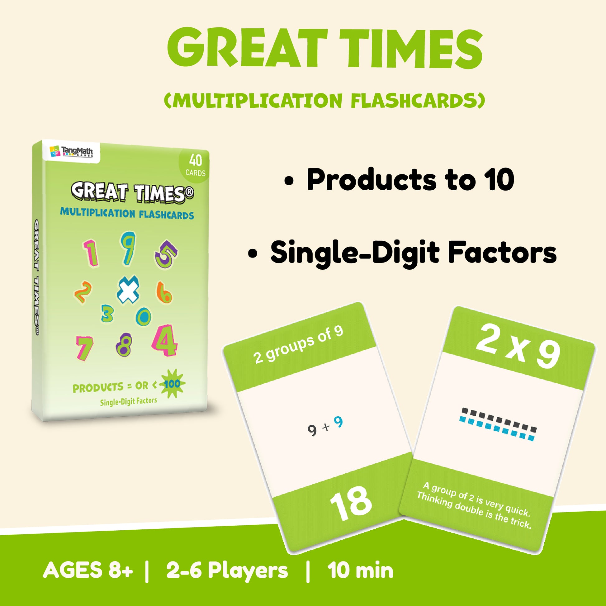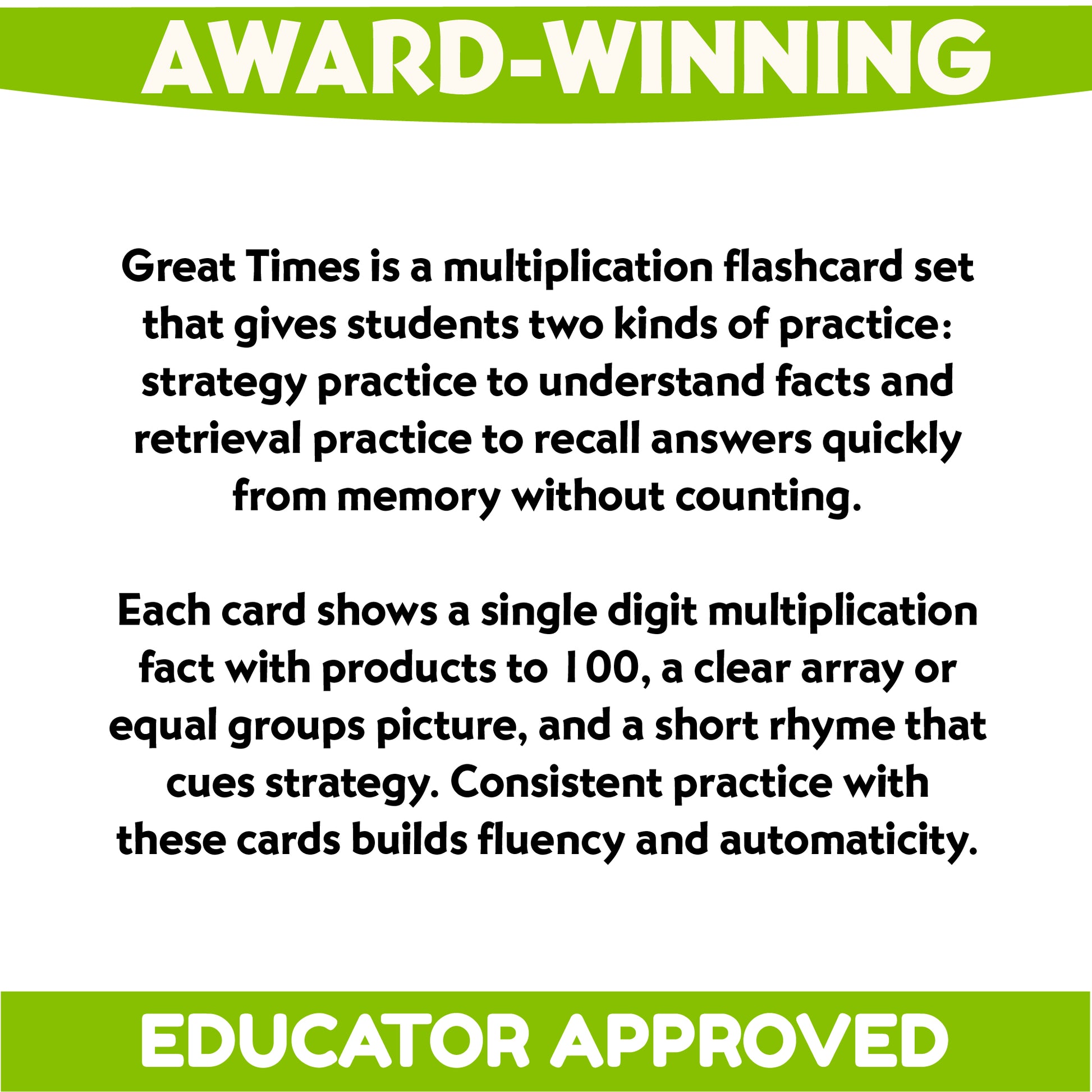 Great Times is a multiplication flashcard set that gives students two kinds of practice: strategy practice to understand facts and retrieval practice to recall answers quickly. Retrieval practice means saying the answer from memory without counting. Each card shows a single digit multiplication fact with products to 100, a clear array or equal groups picture, and a short rhyme that cues strategy. Consistent practice with these cards builds fluency and automaticity.