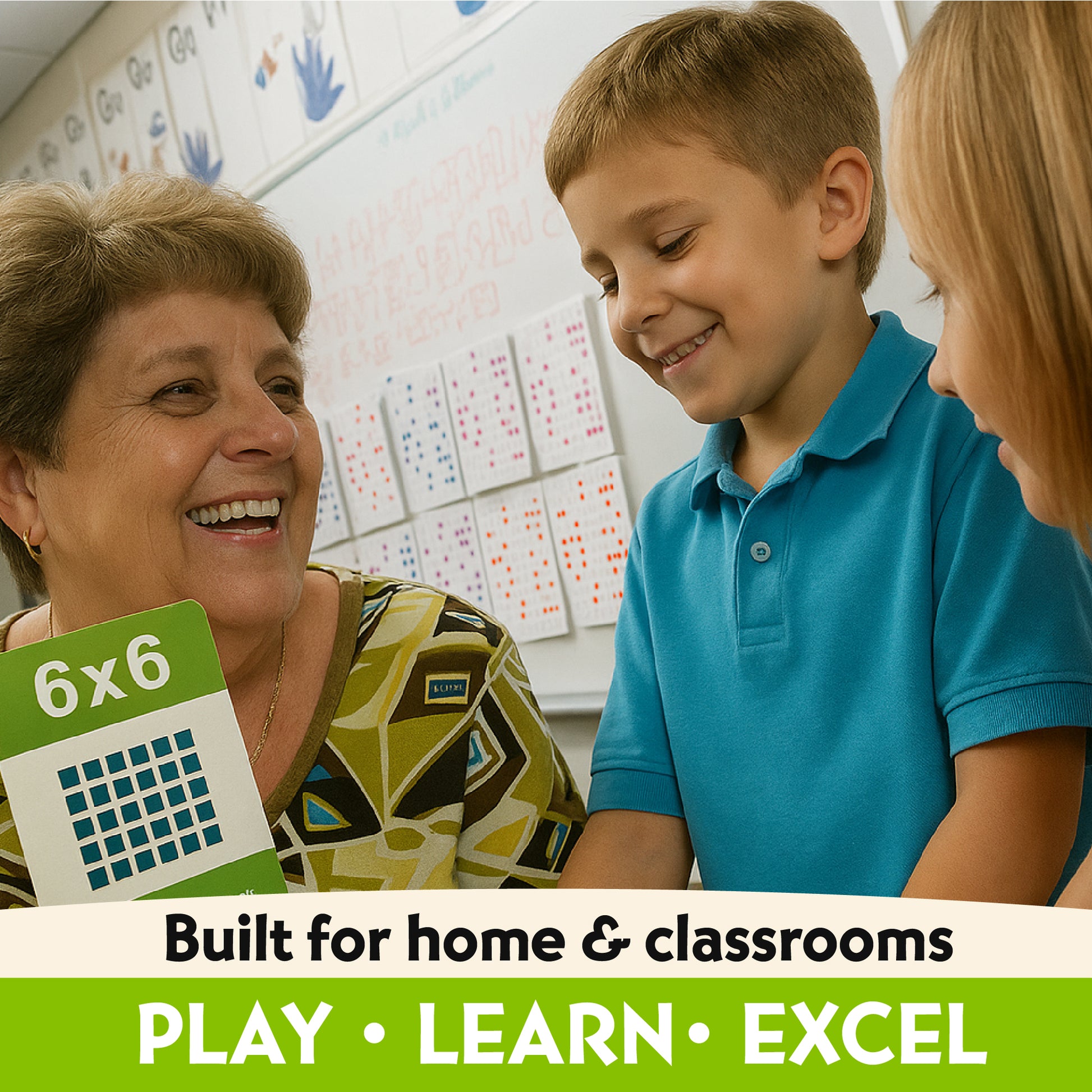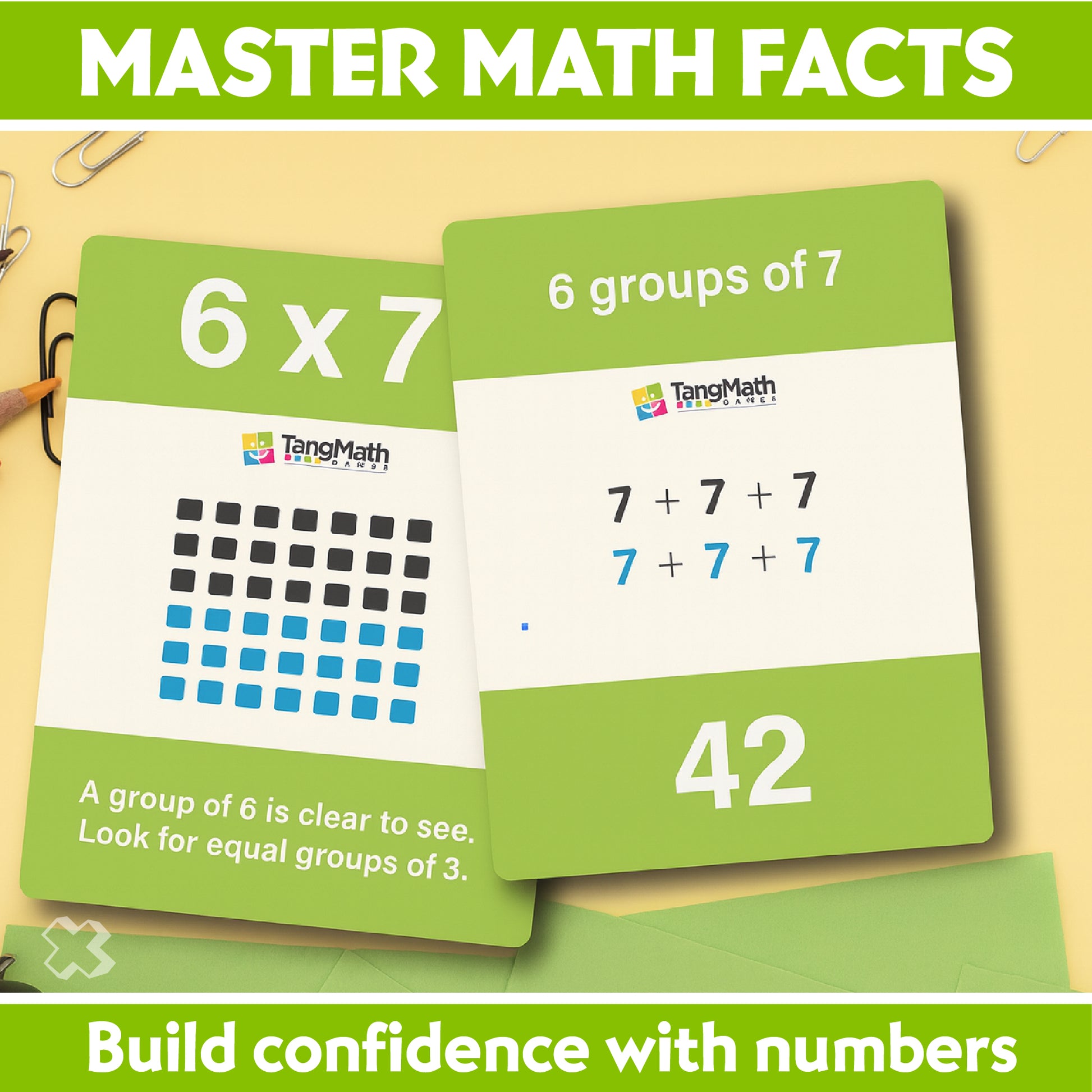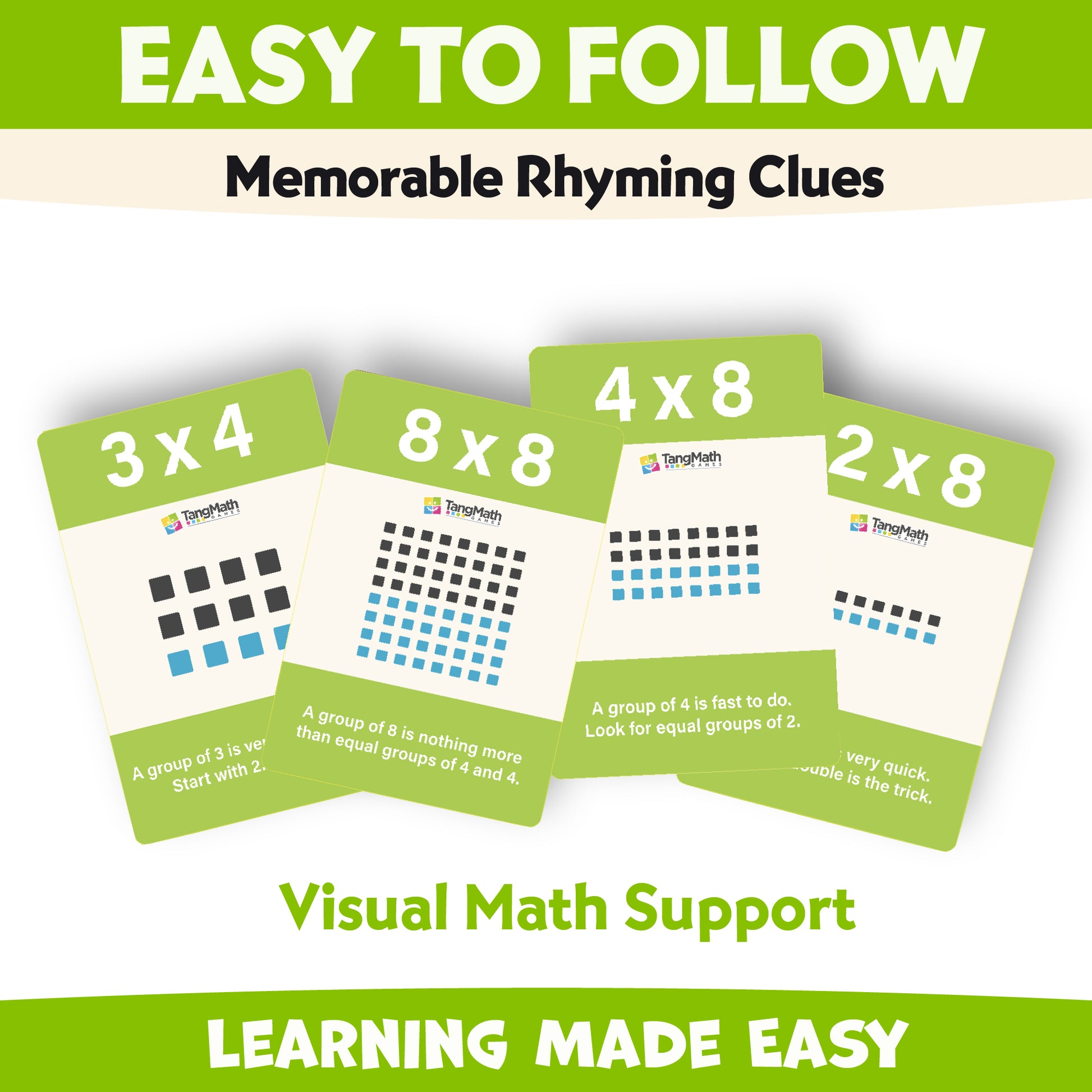 Great Times is a multiplication flashcard set that gives students two kinds of practice: strategy practice to understand facts and retrieval practice to recall answers quickly. Retrieval practice means saying the answer from memory without counting. Each card shows a single digit multiplication fact with products to 100, a clear array or equal groups picture, and a short rhyme that cues strategy. Consistent practice with these cards builds fluency and automaticity.