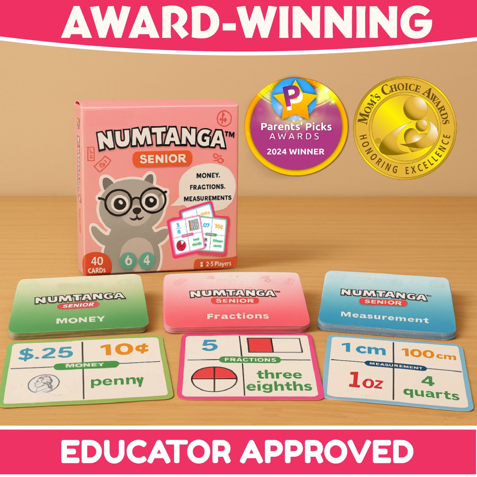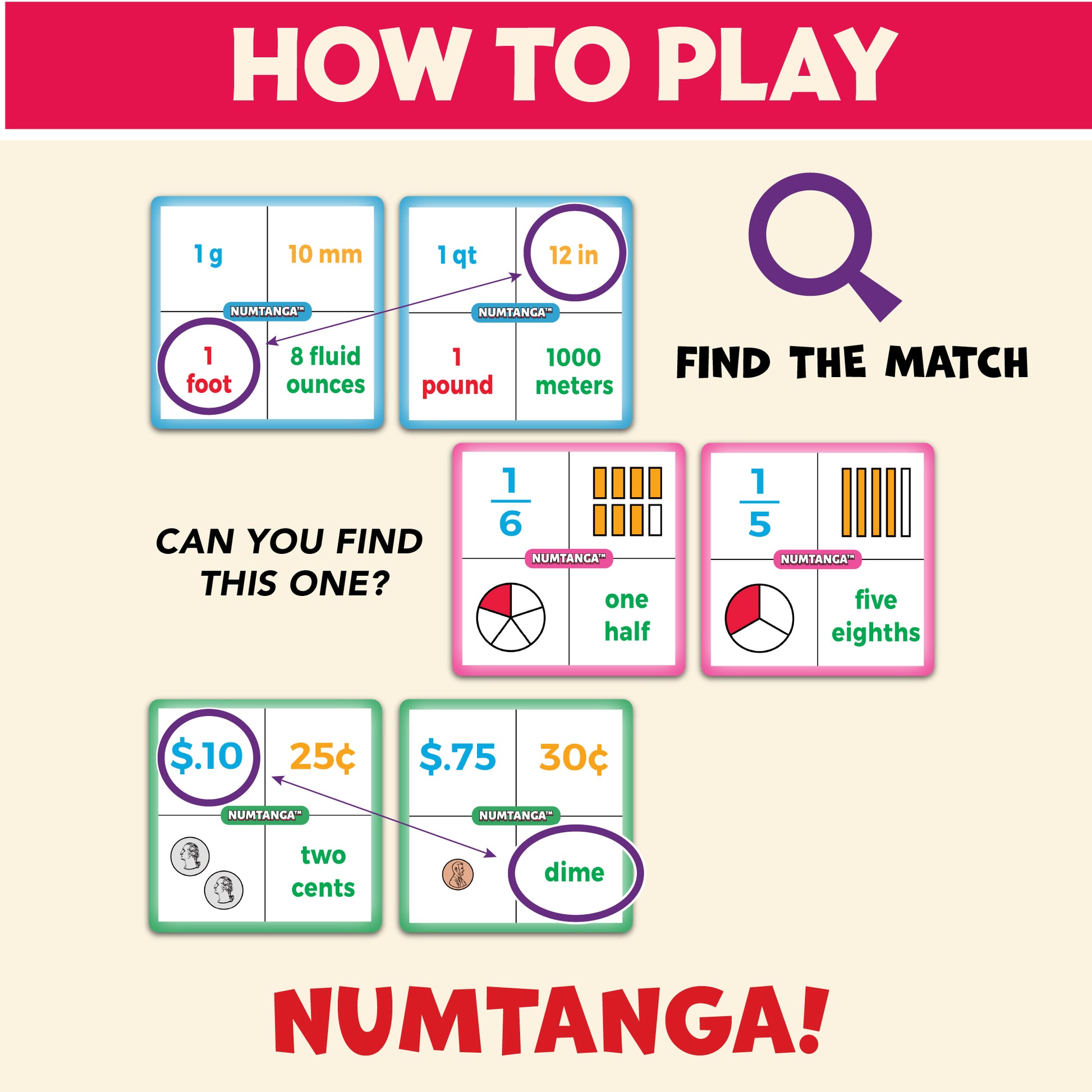 NumTanga Sr is a card game that strengthens understanding of money, fractions, and measurement. Players match equivalent values shown in coins and bills, fraction models, and common units to see relationships and reason about size.